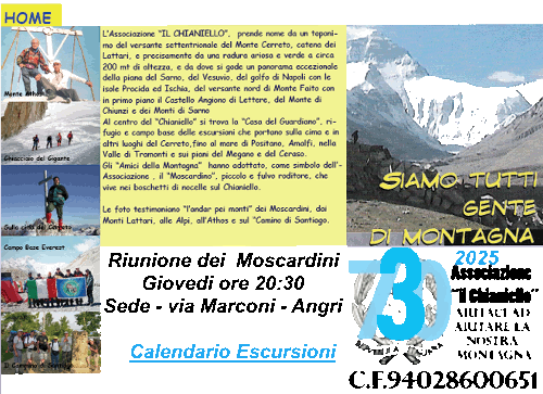 Chi siamo - Contatti - I nostri sentieri - Le Escursioni - I Monti Lattari - Le Pubblicazioni - La Foglia - I racconti di Henyo - I Monti di Francesco - La Casa del Guardiano - Attimi da ricordare - Manifestazioni - I nostri viaggi - Links